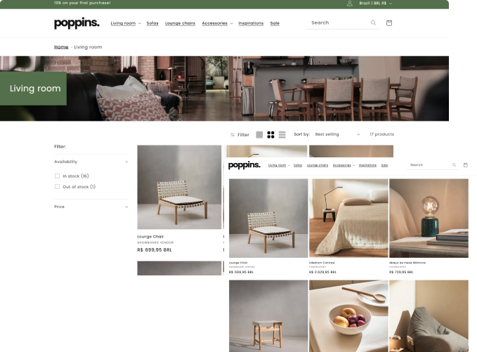 Sofisticado e envolvente para a venda de produtos de decoração, casa e móveis. O template Poppins é a escolha ideal. Descubra a beleza em cada clique e conduza seus clientes a uma jornada de compra extraordinária. Transforme a experiência de compra em algo verdadeiramente memorável.